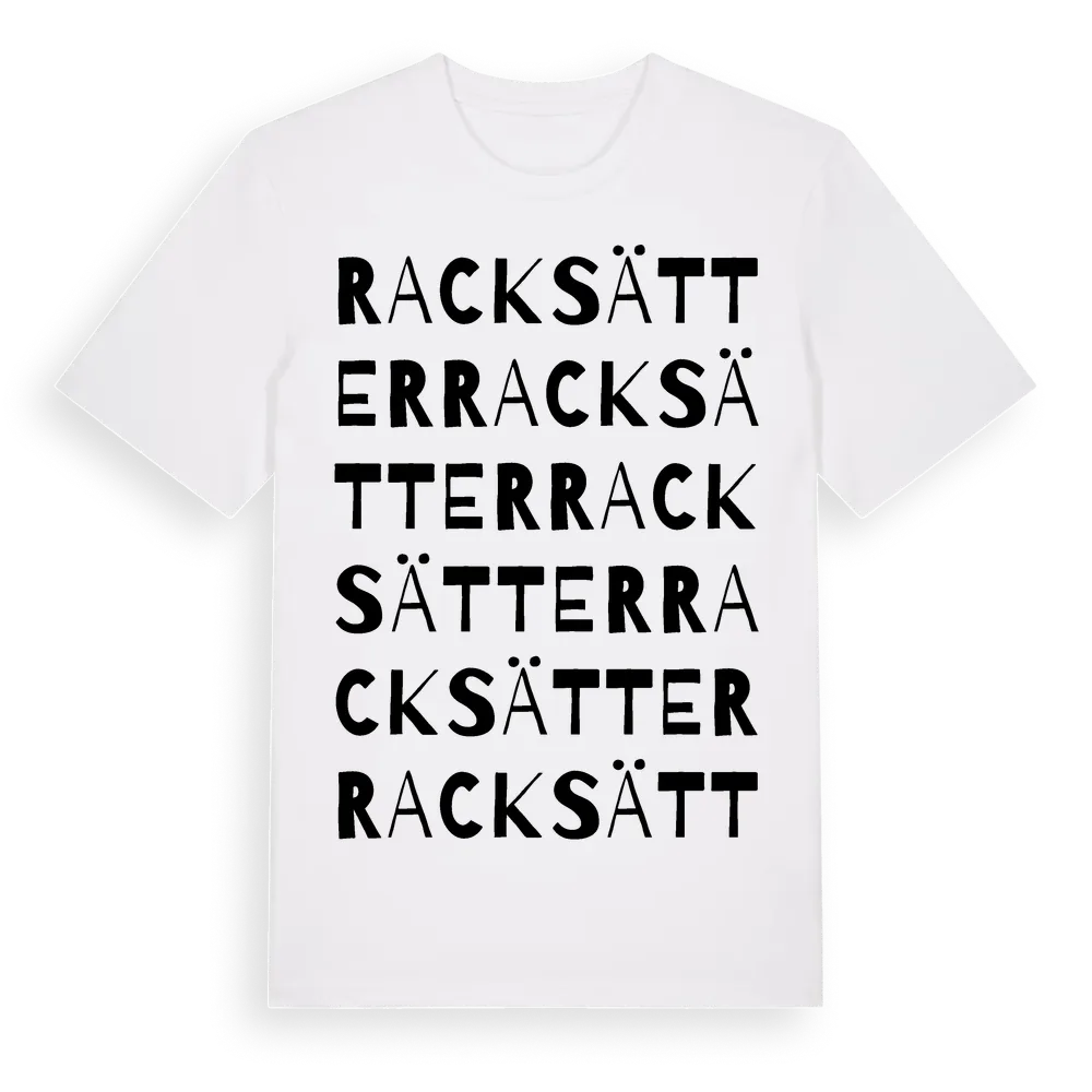 Racksätter ordlek t-shirt är inspirerad av byn Racksätter i Västmanlands län, Sverige. Tröjan är designad för dig som har en speciell koppling till platsen – oavsett om du bor här, har rötterna här eller bara älskar Racksätter.