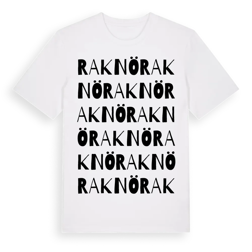 En ordlek byggd på Raknös namn. Subtilt och klurig – ett motiv som bara de som verkligen känner platsen fullt ut förstår. Premium bomull, unisex – från Raknö i Västmanlands län.