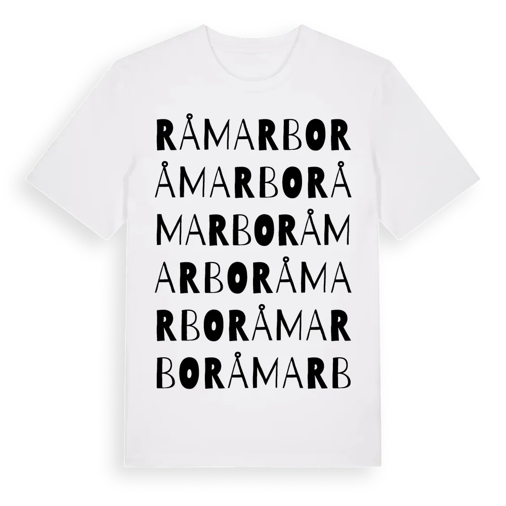 Råmarbo ordlek t-shirt är inspirerad av Råmarbo i Västmanlands län, Sverige. Tröjan är designad för dig som har en speciell koppling till platsen – oavsett om du bor här, har rötterna här eller bara älskar Råmarbo.