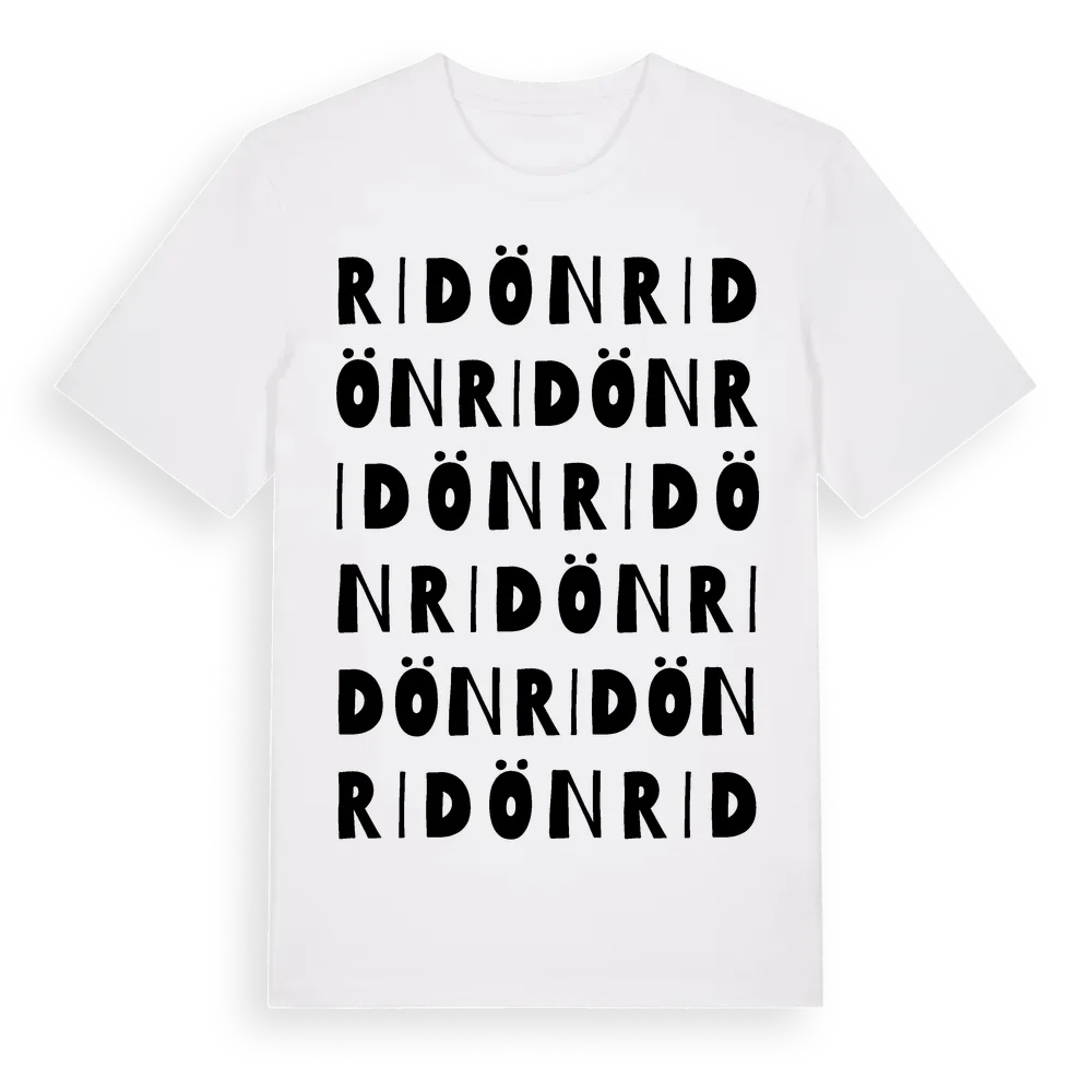 En ordlek byggd på Ridöns namn. Subtilt och klurig – ett motiv som bara de som verkligen känner platsen fullt ut förstår. Premium bomull, unisex – från ön Ridön i Västmanlands län.