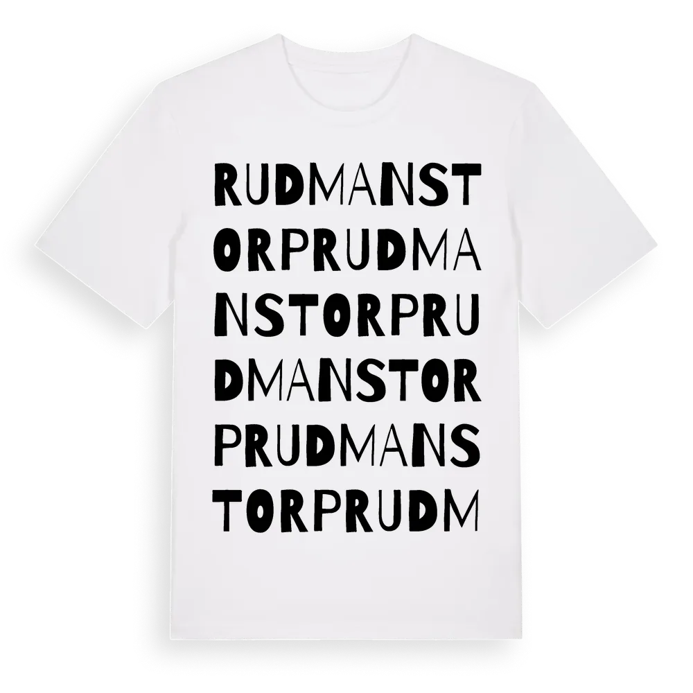 Rudmanstorp ordlek t-shirt är inspirerad av Rudmanstorp i Västmanlands län, Sverige. Tröjan är designad för dig som har en speciell koppling till platsen – oavsett om du bor här, har rötterna här eller bara älskar Rudmanstorp.