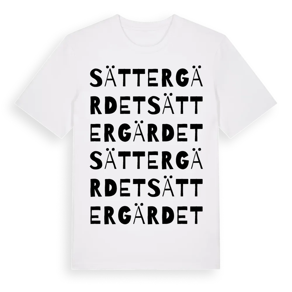 Sättergärdet ordlek t-shirt är inspirerad av Sättergärdet i Västmanlands län, Sverige. Tröjan är designad för dig som har en speciell koppling till platsen – oavsett om du bor här, har rötterna här eller bara älskar Sättergärdet.