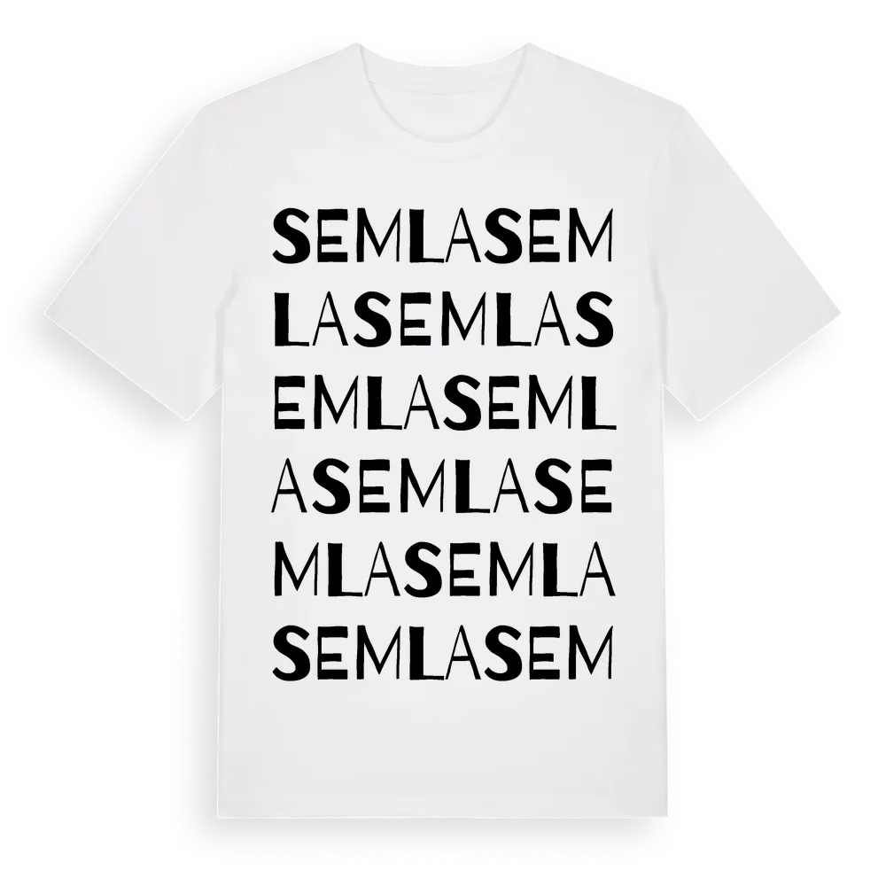 Semla ordlek t-shirt är inspirerad av byn Semla i Västmanlands län, Sverige. Tröjan är designad för dig som har en speciell koppling till platsen – oavsett om du bor här, har rötterna här eller bara älskar Semla.