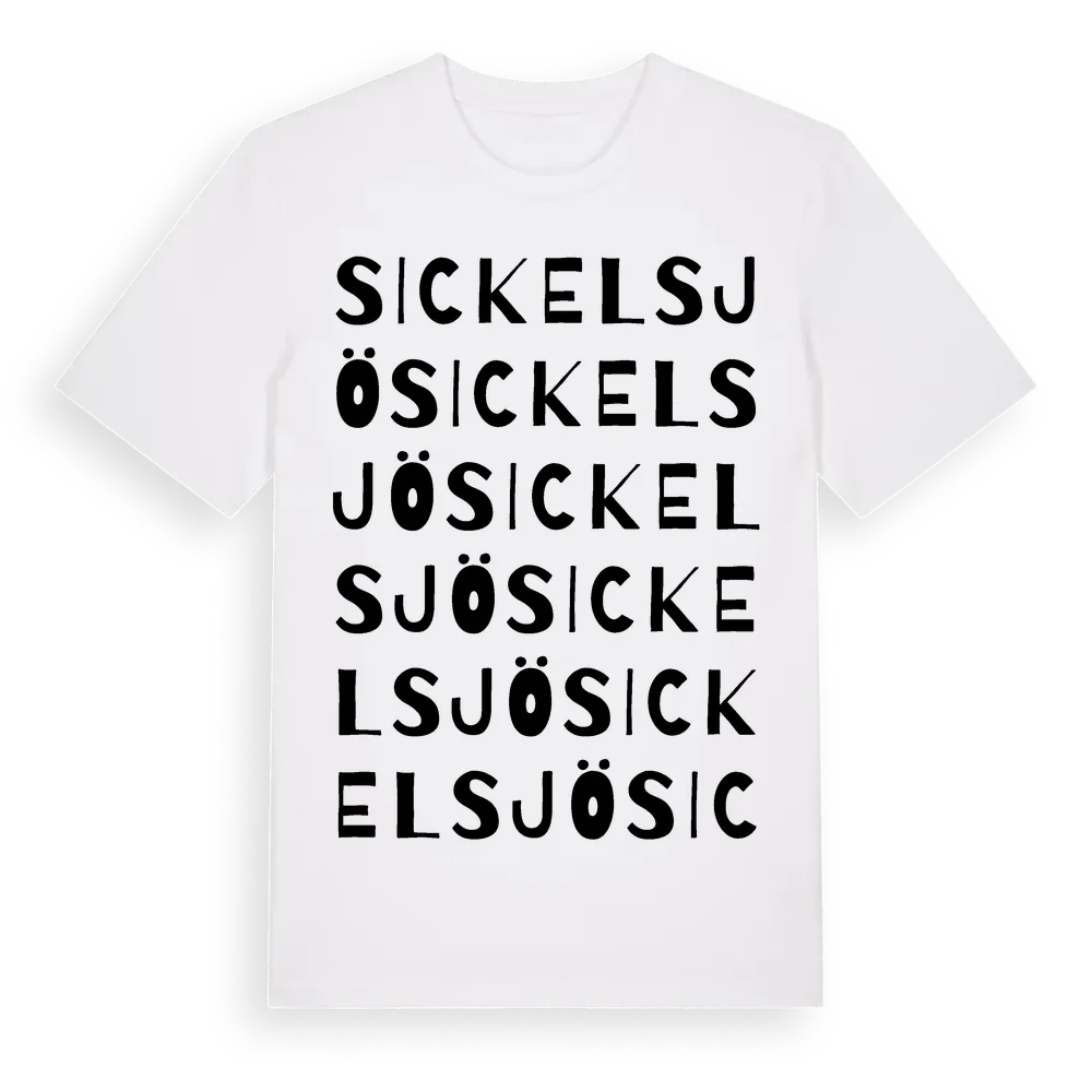 Sickelsjö ordlek t-shirt är inspirerad av Sickelsjö i Västmanlands län, Sverige. Tröjan är designad för dig som har en speciell koppling till platsen – oavsett om du bor här, har rötterna här eller bara älskar Sickelsjö.