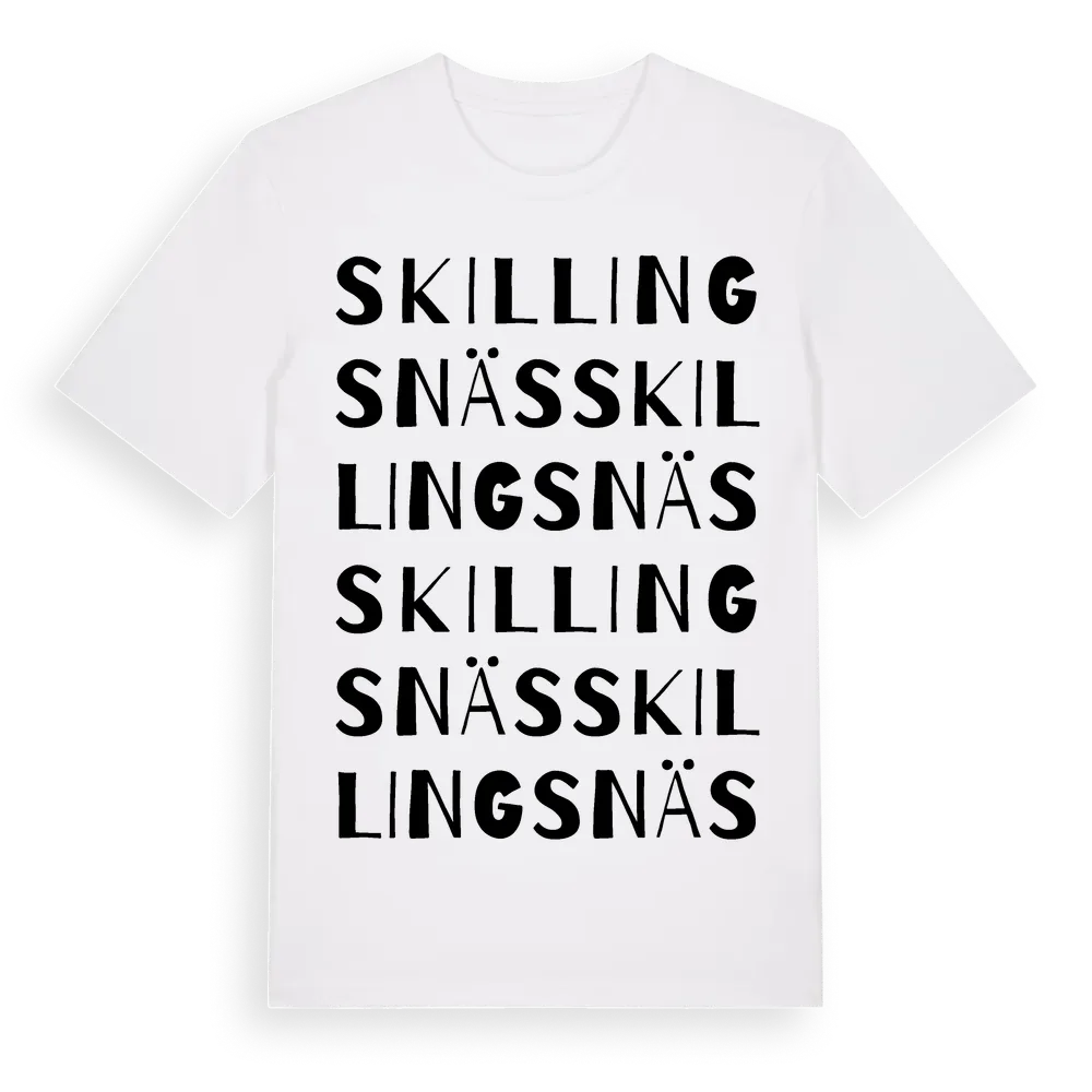 Skillingsnäs ordlek t-shirt är inspirerad av Skillingsnäs i Västmanlands län, Sverige. Tröjan är designad för dig som har en speciell koppling till platsen – oavsett om du bor här, har rötterna här eller bara älskar Skillingsnäs.