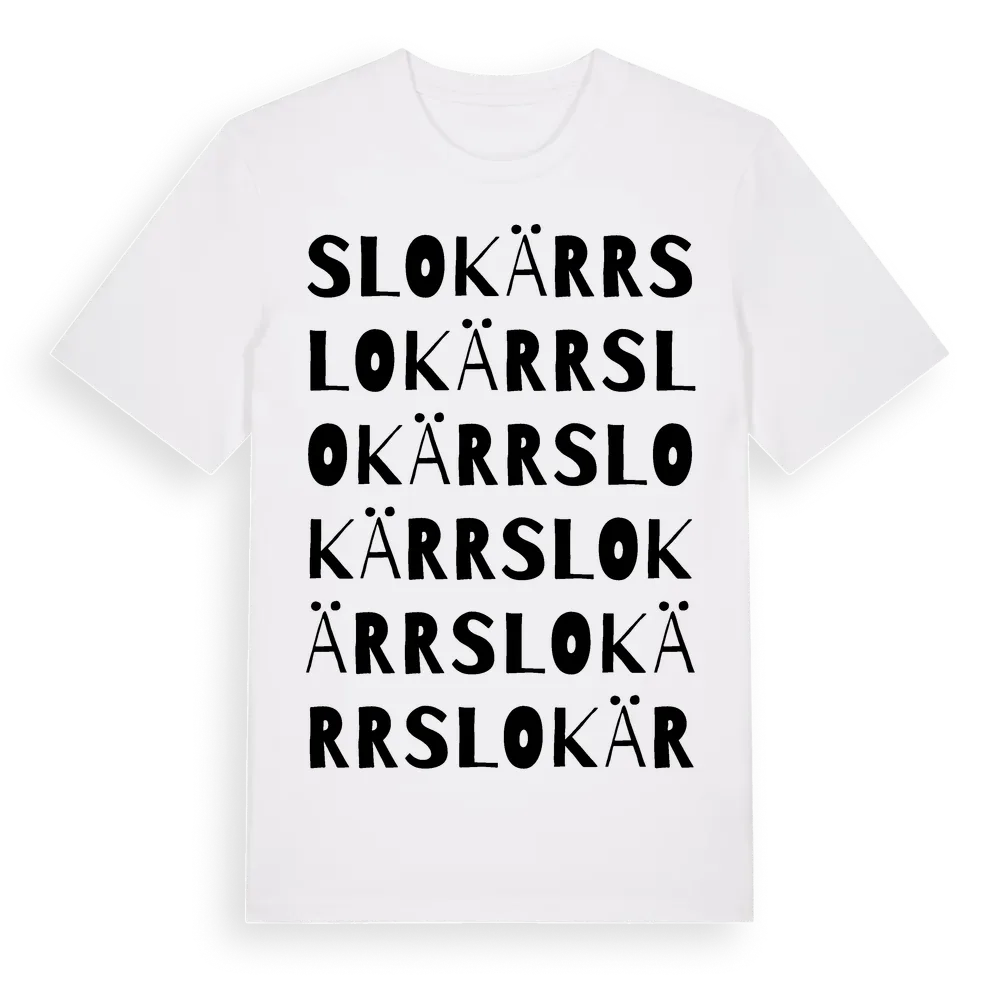 Slokärr ordlek t-shirt är inspirerad av byn Slokärr i Västmanlands län, Sverige. Tröjan är designad för dig som har en speciell koppling till platsen – oavsett om du bor här, har rötterna här eller bara älskar Slokärr.