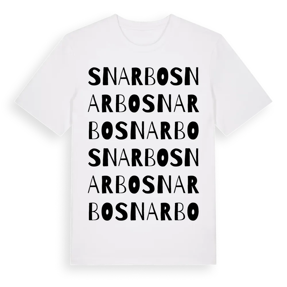 Snarbo ordlek t-shirt är inspirerad av Snarbo i Västmanlands län, Sverige. Tröjan är designad för dig som har en speciell koppling till platsen – oavsett om du bor här, har rötterna här eller bara älskar Snarbo.