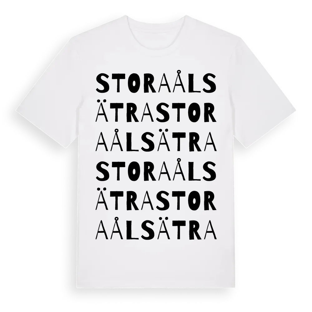 Stora Ålsätra ordlek t-shirt är inspirerad av Stora Ålsätra i Västmanlands län, Sverige. Tröjan är designad för dig som har en speciell koppling till platsen – oavsett om du bor här, har rötterna här eller bara älskar Stora Ålsätra.