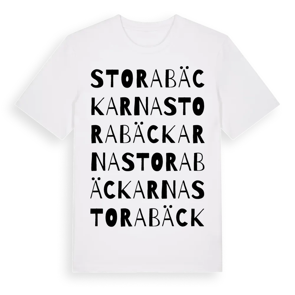 Stora Bäckarna ordlek t-shirt är inspirerad av Stora Bäckarna i Västmanlands län, Sverige. Tröjan är designad för dig som har en speciell koppling till platsen – oavsett om du bor här, har rötterna här eller bara älskar Stora Bäckarna.