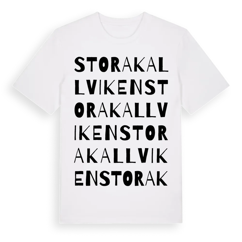 Stora Kallviken ordlek t-shirt är inspirerad av Stora Kallviken i Västmanlands län, Sverige. Tröjan är designad för dig som har en speciell koppling till platsen – oavsett om du bor här, har rötterna här eller bara älskar Stora Kallviken.