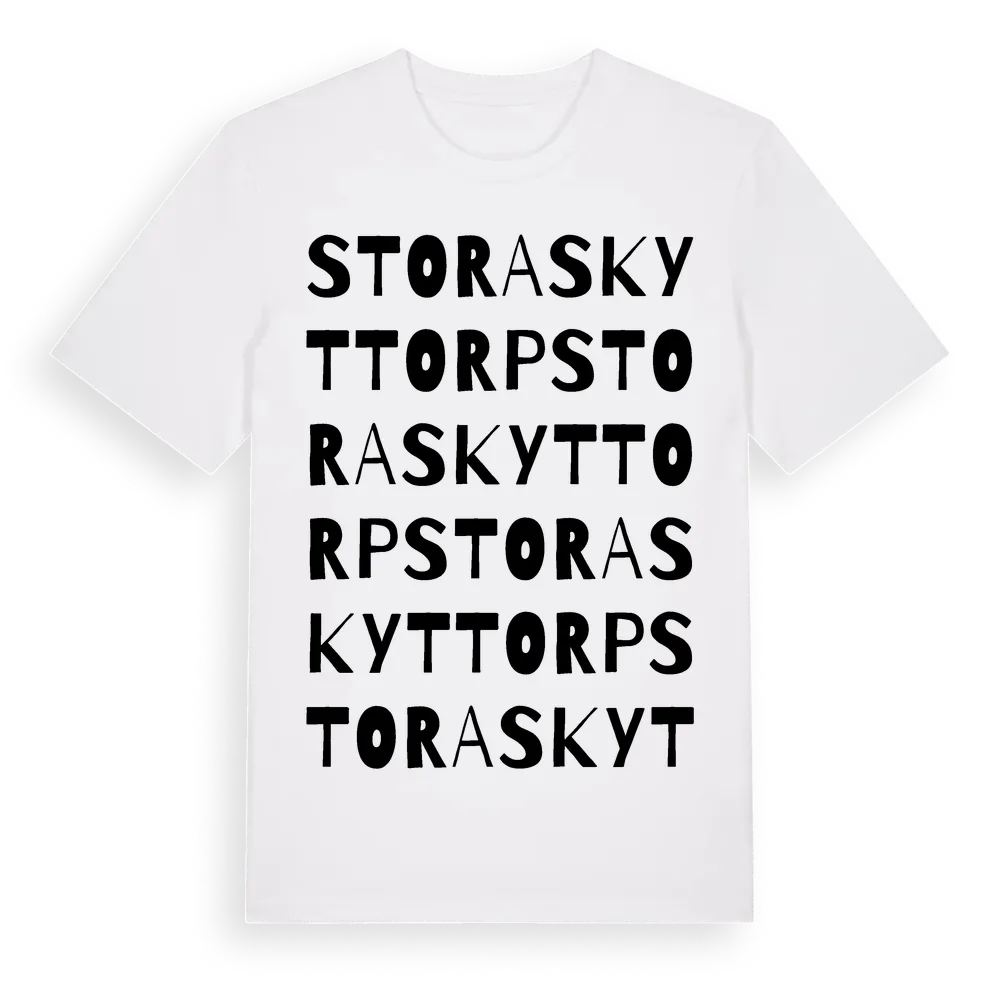 Stora Skyttorp ordlek t-shirt är inspirerad av Stora Skyttorp i Västmanlands län, Sverige. Tröjan är designad för dig som har en speciell koppling till platsen – oavsett om du bor här, har rötterna här eller bara älskar Stora Skyttorp.