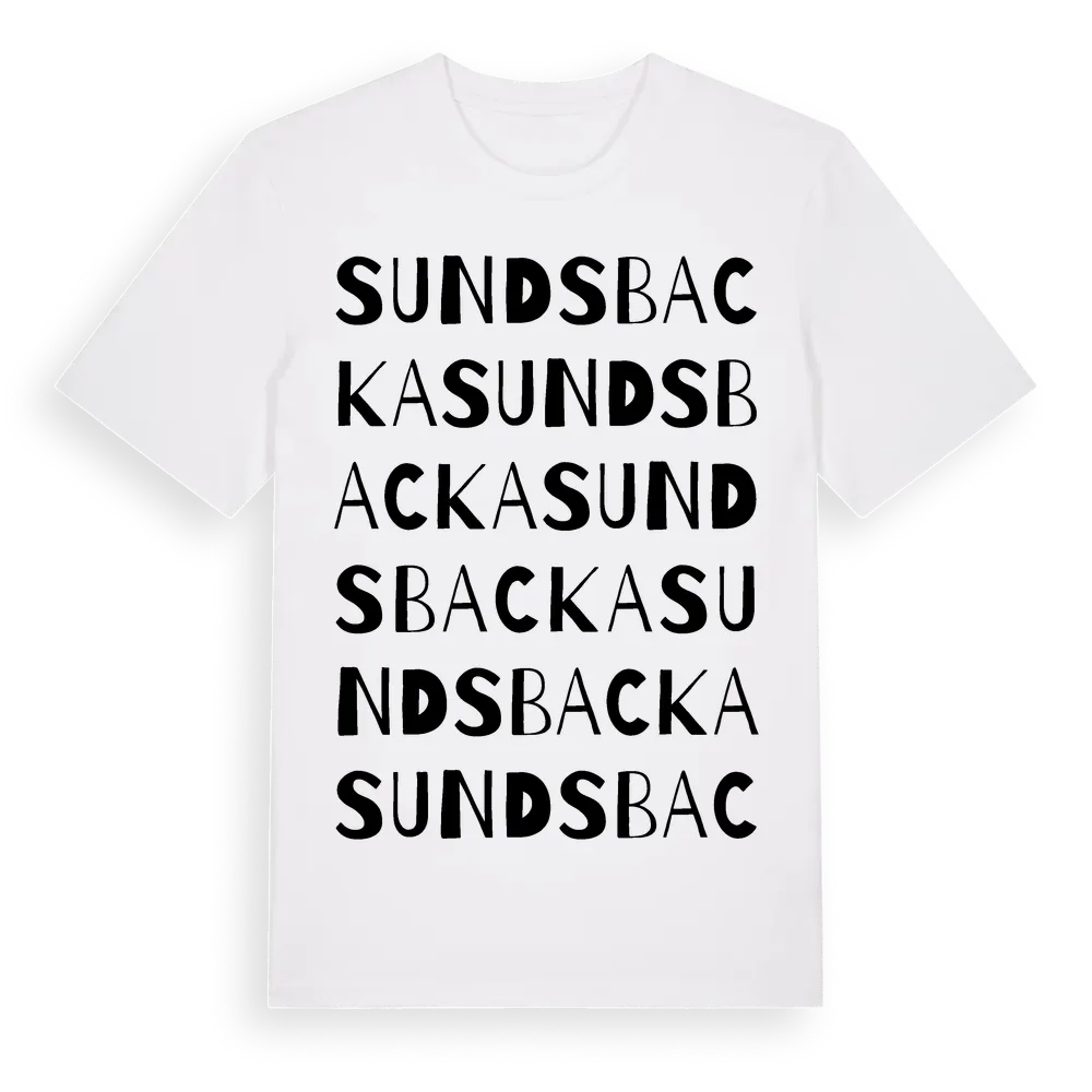 Sundsbacka ordlek t-shirt är inspirerad av Sundsbacka i Västmanlands län, Sverige. Tröjan är designad för dig som har en speciell koppling till platsen – oavsett om du bor här, har rötterna här eller bara älskar Sundsbacka.