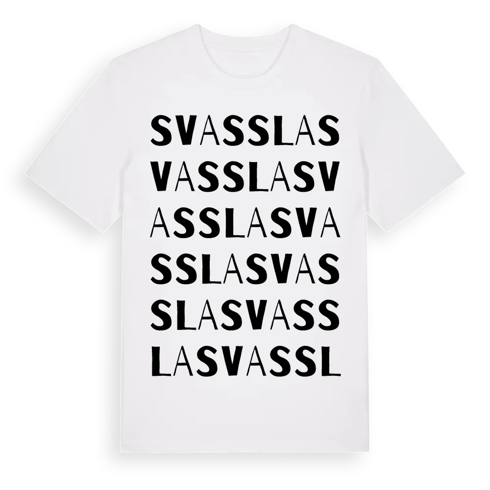 Svassla ordlek t-shirt är inspirerad av byn Svassla i Västmanlands län, Sverige. Tröjan är designad för dig som har en speciell koppling till platsen – oavsett om du bor här, har rötterna här eller bara älskar Svassla.