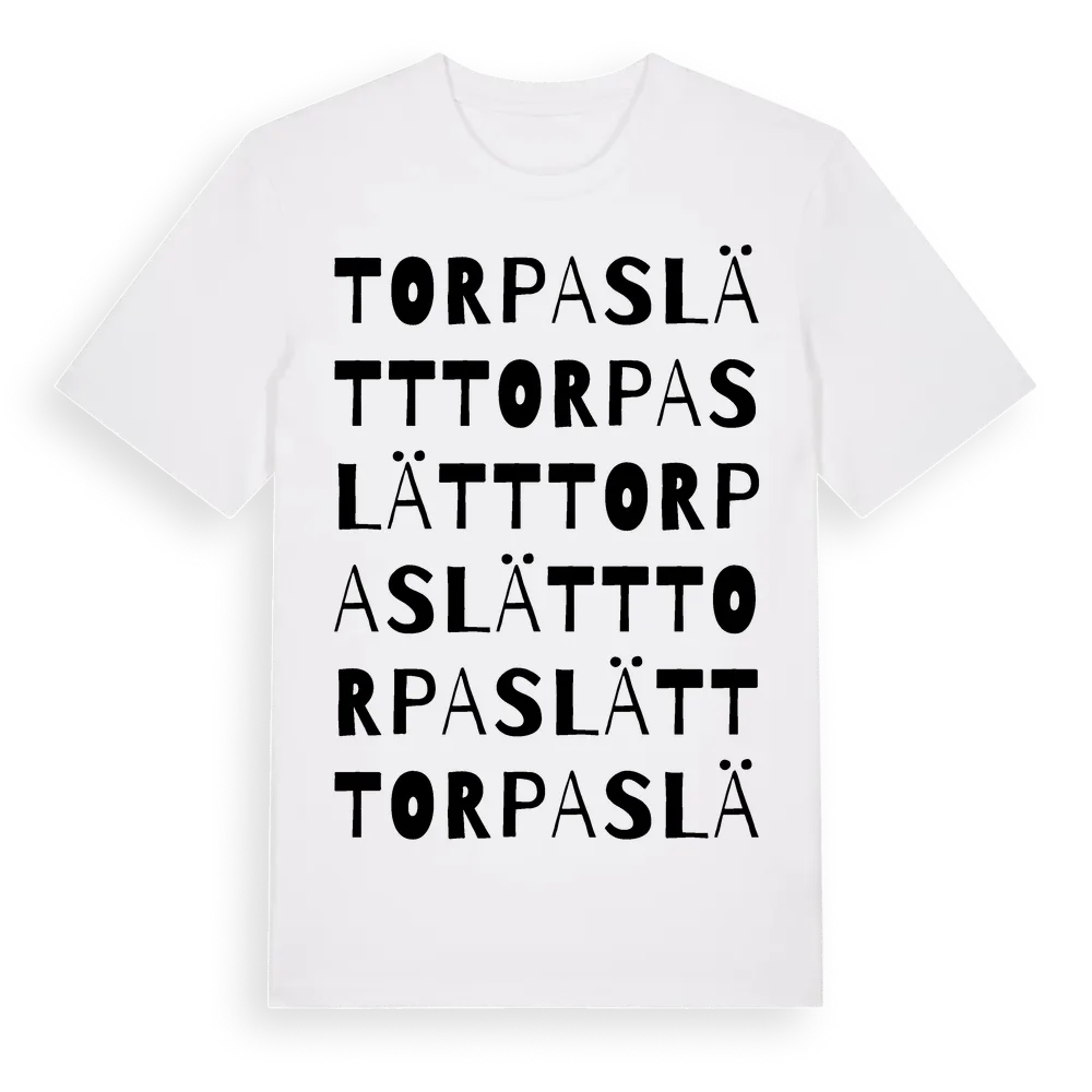 Torpaslätt ordlek t-shirt är inspirerad av byn Torpaslätt i Västmanlands län, Sverige. Tröjan är designad för dig som har en speciell koppling till platsen – oavsett om du bor här, har rötterna här eller bara älskar Torpaslätt.