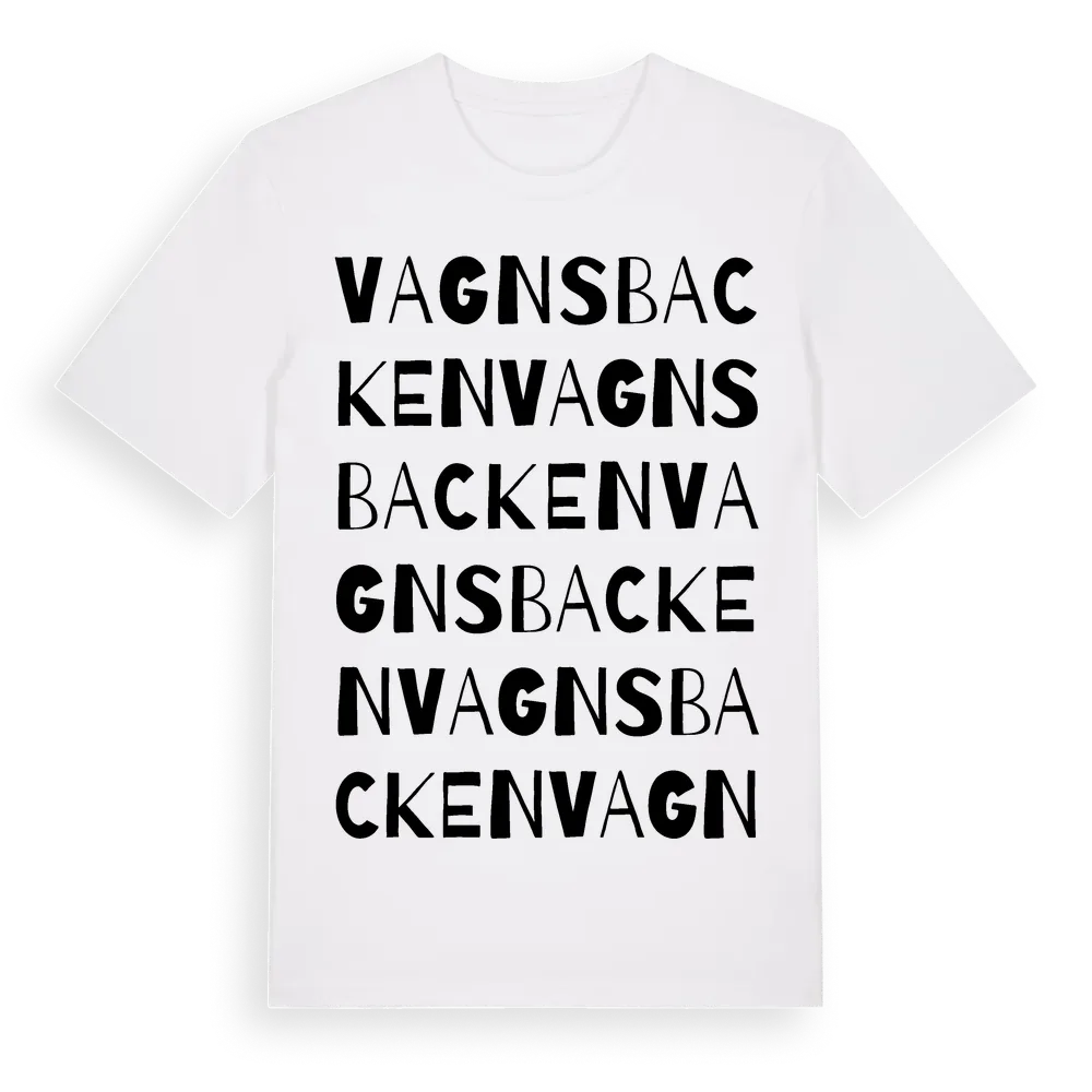 Vagnsbacken ordlek t-shirt är inspirerad av Vagnsbacken i Västmanlands län, Sverige. Tröjan är designad för dig som har en speciell koppling till platsen – oavsett om du bor här, har rötterna här eller bara älskar Vagnsbacken.