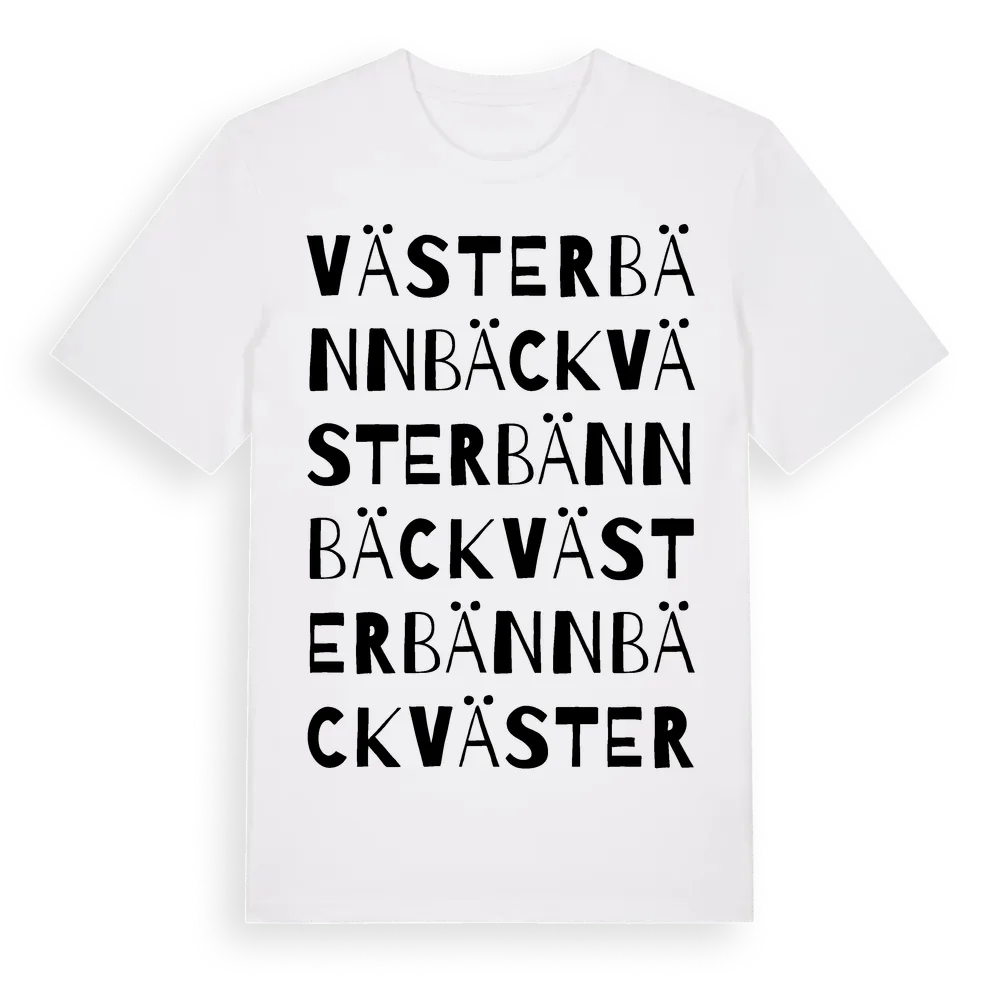 Väster Bännbäck ordlek t-shirt är inspirerad av byn Väster Bännbäck i Västmanlands län, Sverige. Tröjan är designad för dig som har en speciell koppling till platsen – oavsett om du bor här, har rötterna här eller bara älskar Väster Bännbäck.
