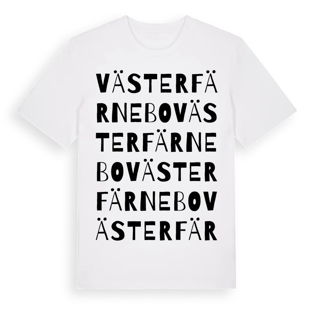 Västerfärnebo ordlek t-shirt är inspirerad av byn Västerfärnebo i Västmanlands län, Sverige. Tröjan är designad för dig som har en speciell koppling till platsen – oavsett om du bor här, har rötterna här eller bara älskar Västerfärnebo.