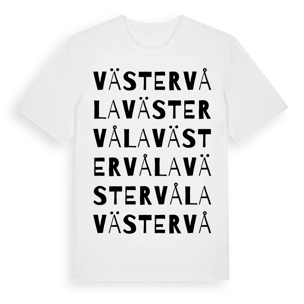 Västervåla ordlek t-shirt är inspirerad av byn Västervåla i Västmanlands län, Sverige. Tröjan är designad för dig som har en speciell koppling till platsen – oavsett om du bor här, har rötterna här eller bara älskar Västervåla.