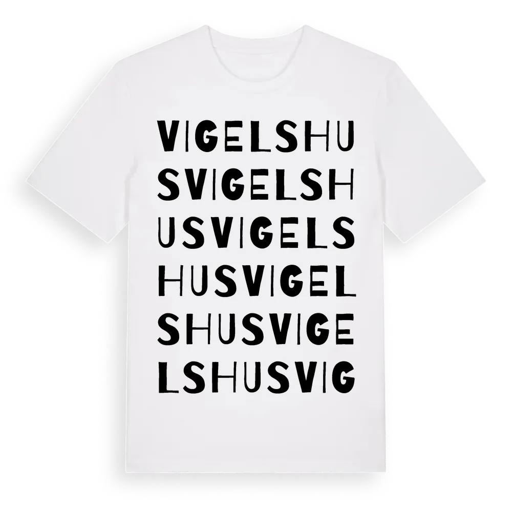 En ordlek byggd på Vigelshuss namn. Subtilt och klurig – ett motiv som bara de som verkligen känner platsen fullt ut förstår. Premium bomull, unisex – från byn Vigelshus i Västmanlands län.