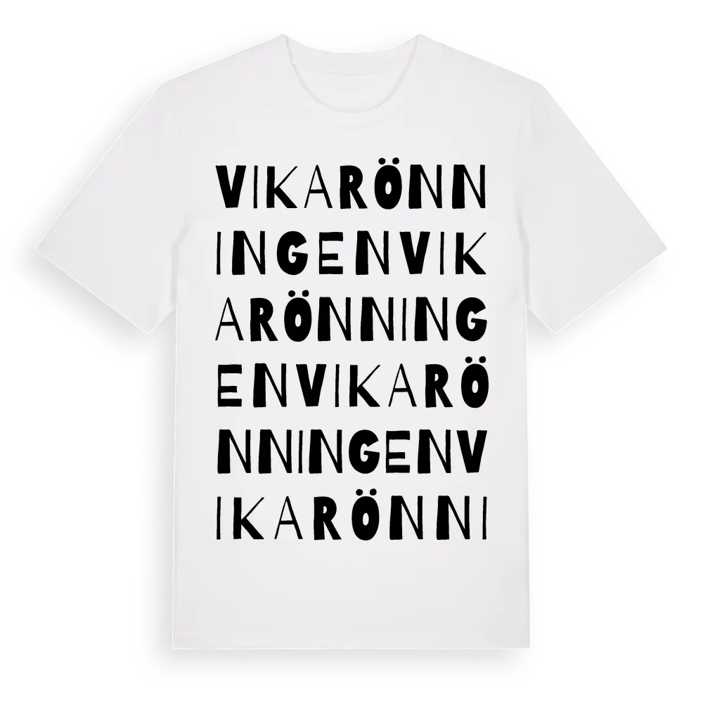 Vikarönningen ordlek t-shirt är inspirerad av byn Vikarönningen i Västmanlands län, Sverige. Tröjan är designad för dig som har en speciell koppling till platsen – oavsett om du bor här, har rötterna här eller bara älskar Vikarönningen.