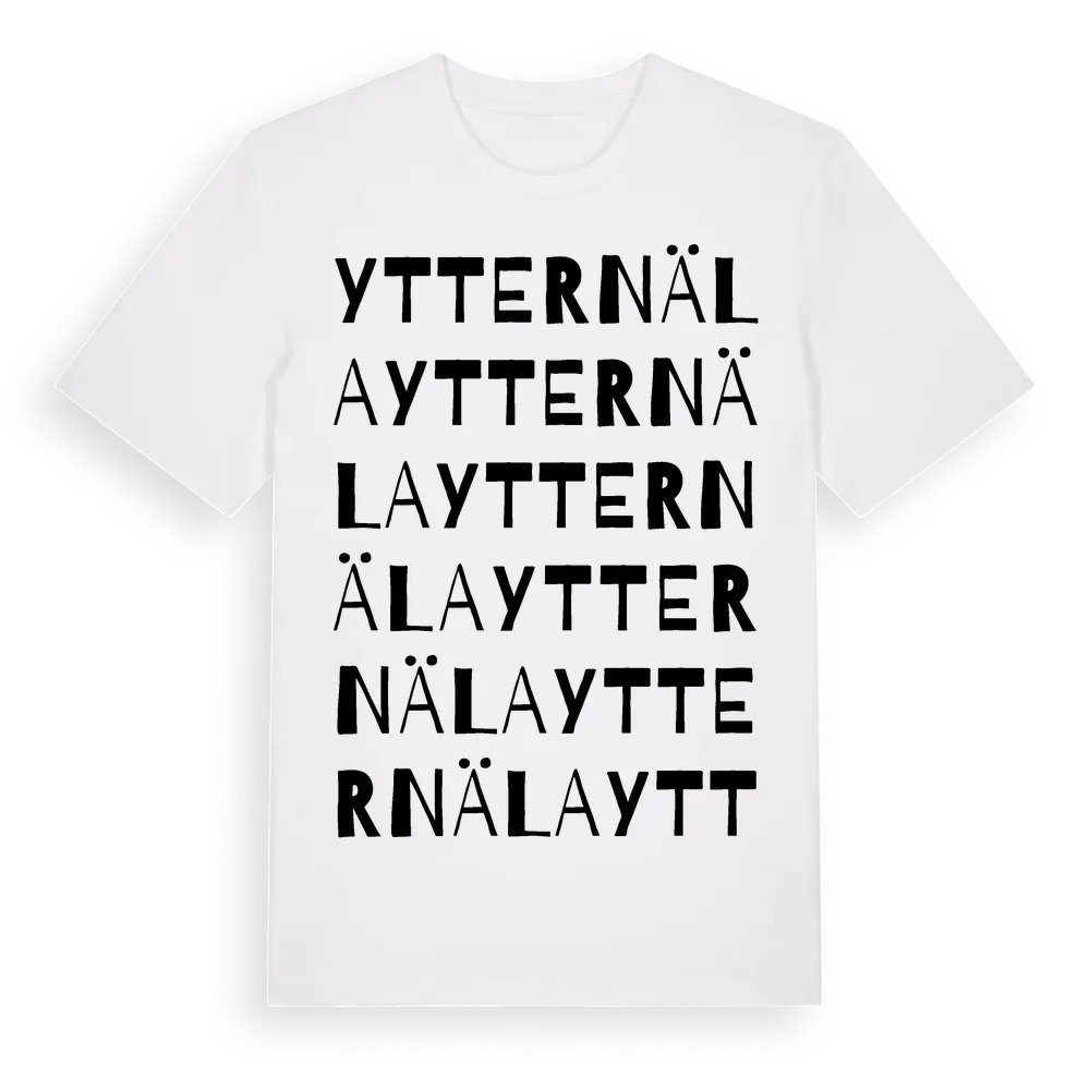 En ordlek byggd på Ytternälas namn. Subtilt och klurig – ett motiv som bara de som verkligen känner platsen fullt ut förstår. Premium bomull, unisex – från Ytternäla i Västmanlands län.