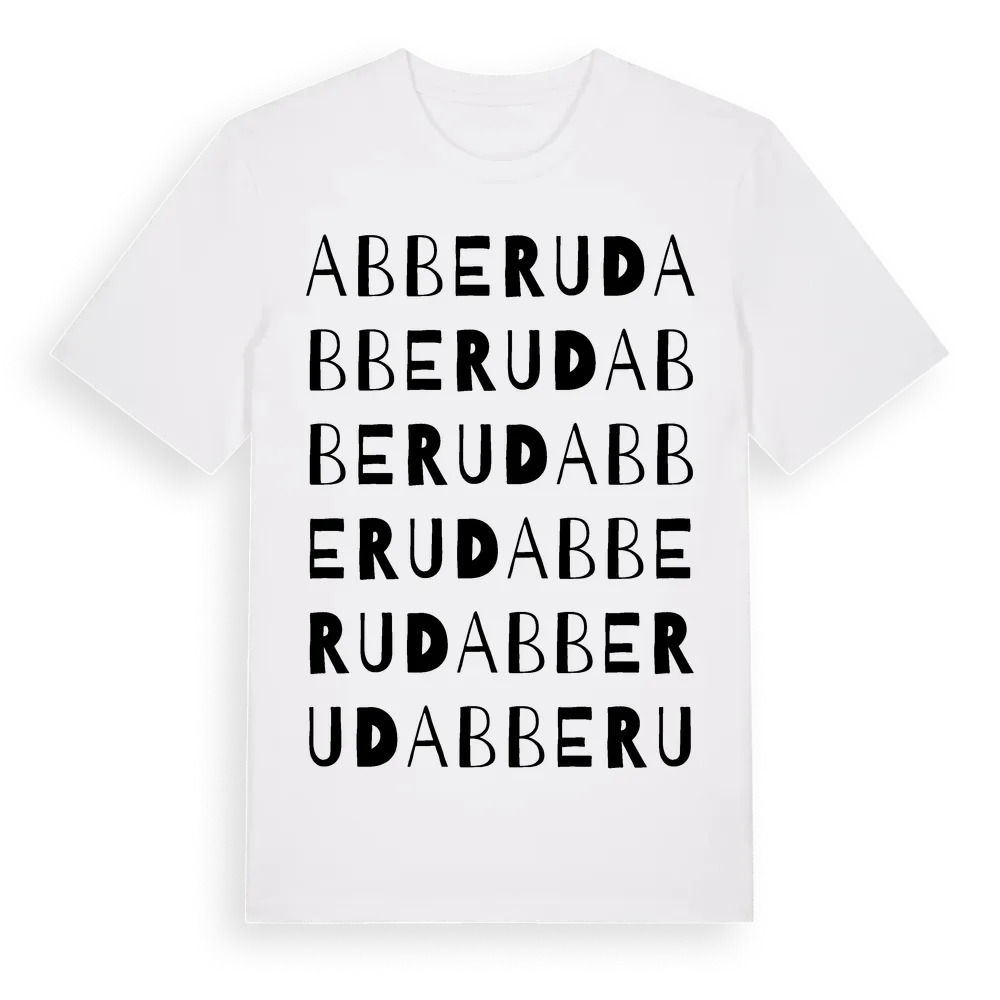 Abberud ordlek t-shirt är inspirerad av byn Abberud i Västra Götalands län, Sverige. Tröjan är designad för dig som har en speciell koppling till platsen – oavsett om du bor här, har rötterna här eller bara älskar Abberud.