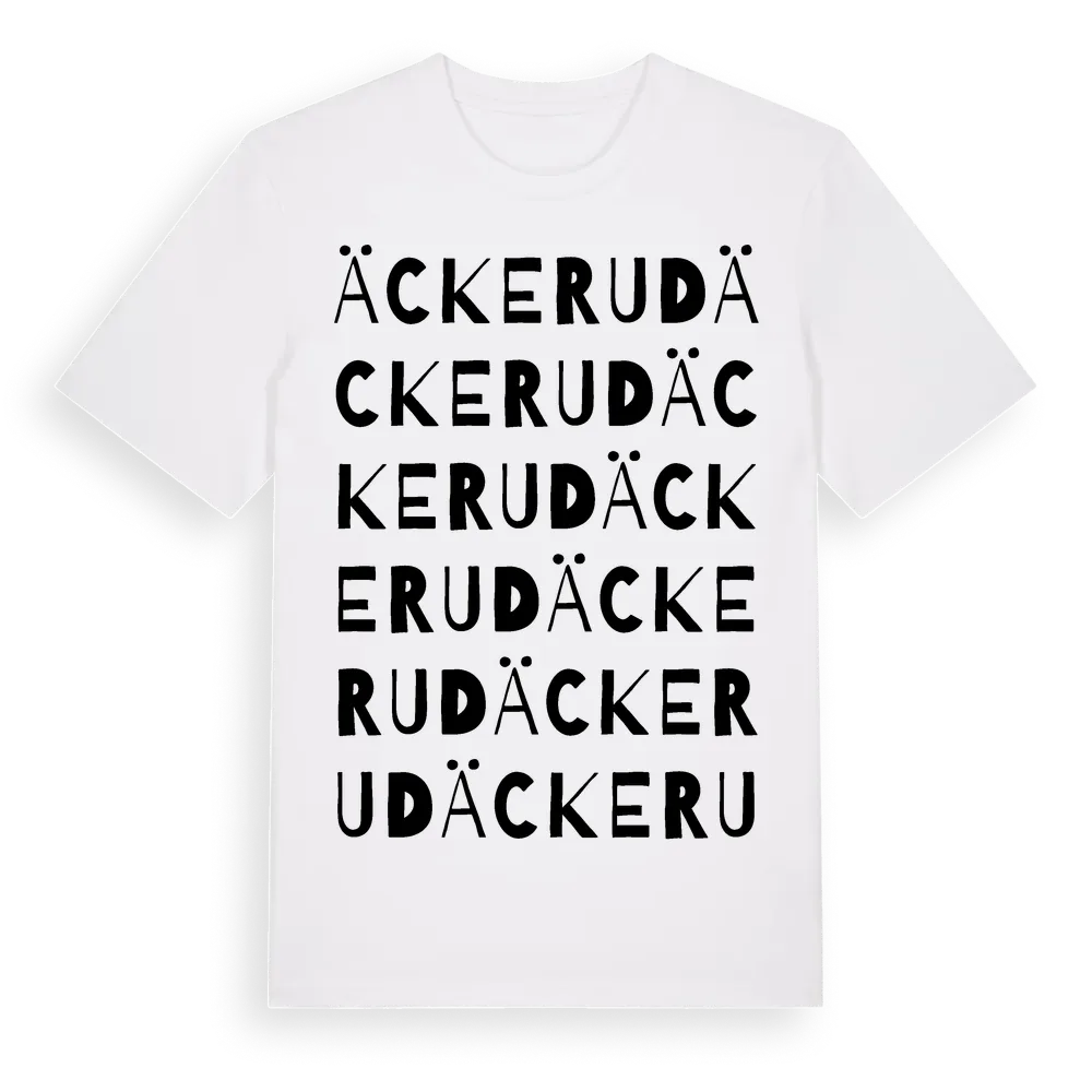 Äckerud ordlek t-shirt är inspirerad av byn Äckerud i Västra Götalands län, Sverige. Tröjan är designad för dig som har en speciell koppling till platsen – oavsett om du bor här, har rötterna här eller bara älskar Äckerud.