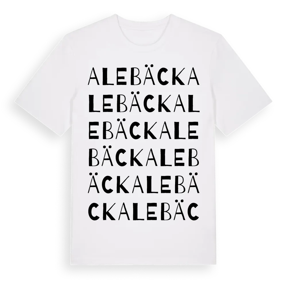 Alebäck ordlek t-shirt är inspirerad av Alebäck i Västra Götalands län, Sverige. Tröjan är designad för dig som har en speciell koppling till platsen – oavsett om du bor här, har rötterna här eller bara älskar Alebäck.