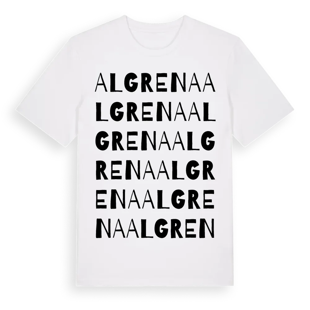 Algrena ordlek t-shirt är inspirerad av Algrena i Västra Götalands län, Sverige. Tröjan är designad för dig som har en speciell koppling till platsen – oavsett om du bor här, har rötterna här eller bara älskar Algrena.