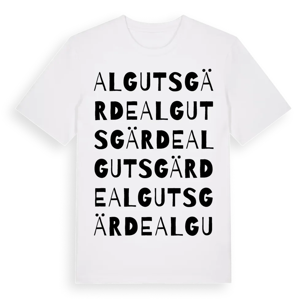 Algutsgärde ordlek t-shirt är inspirerad av Algutsgärde i Västra Götalands län, Sverige. Tröjan är designad för dig som har en speciell koppling till platsen – oavsett om du bor här, har rötterna här eller bara älskar Algutsgärde.
