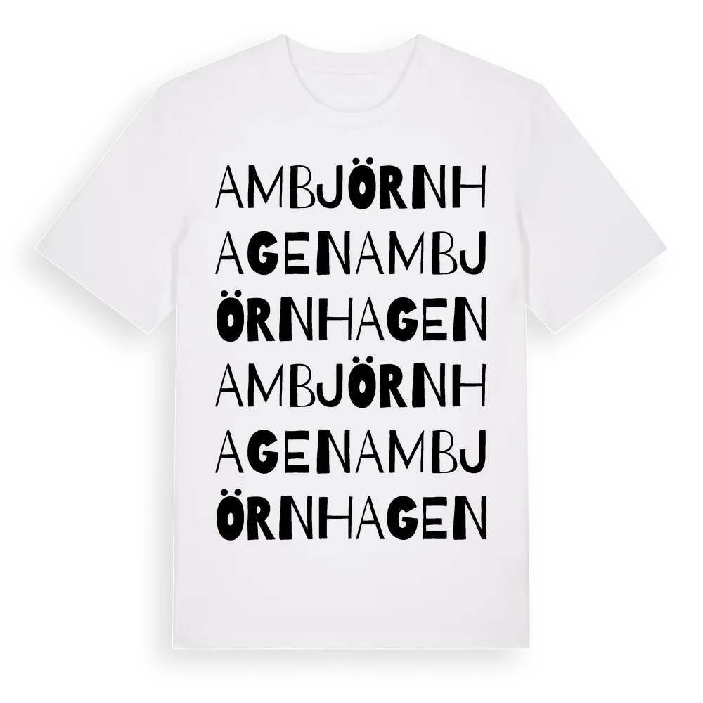 Ambjörnhagen ordlek t-shirt är inspirerad av byn Ambjörnhagen i Västra Götalands län, Sverige. Tröjan är designad för dig som har en speciell koppling till platsen – oavsett om du bor här, har rötterna här eller bara älskar Ambjörnhagen.