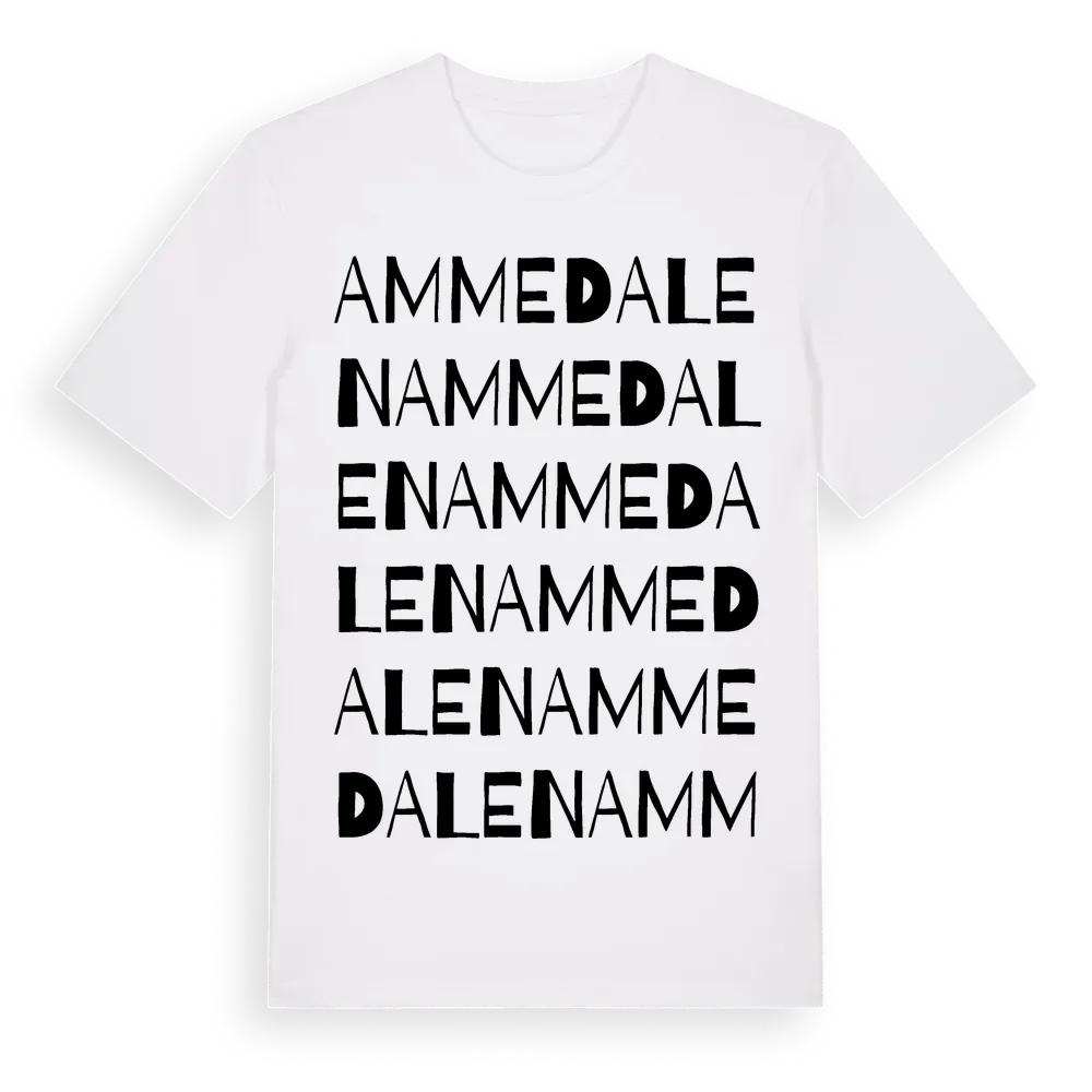 Ammedalen ordlek t-shirt är inspirerad av Ammedalen i Västra Götalands län, Sverige. Tröjan är designad för dig som har en speciell koppling till platsen – oavsett om du bor här, har rötterna här eller bara älskar Ammedalen.