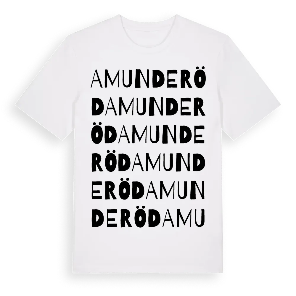 Amunderöd ordlek t-shirt är inspirerad av Amunderöd i Västra Götalands län, Sverige. Tröjan är designad för dig som har en speciell koppling till platsen – oavsett om du bor här, har rötterna här eller bara älskar Amunderöd.
