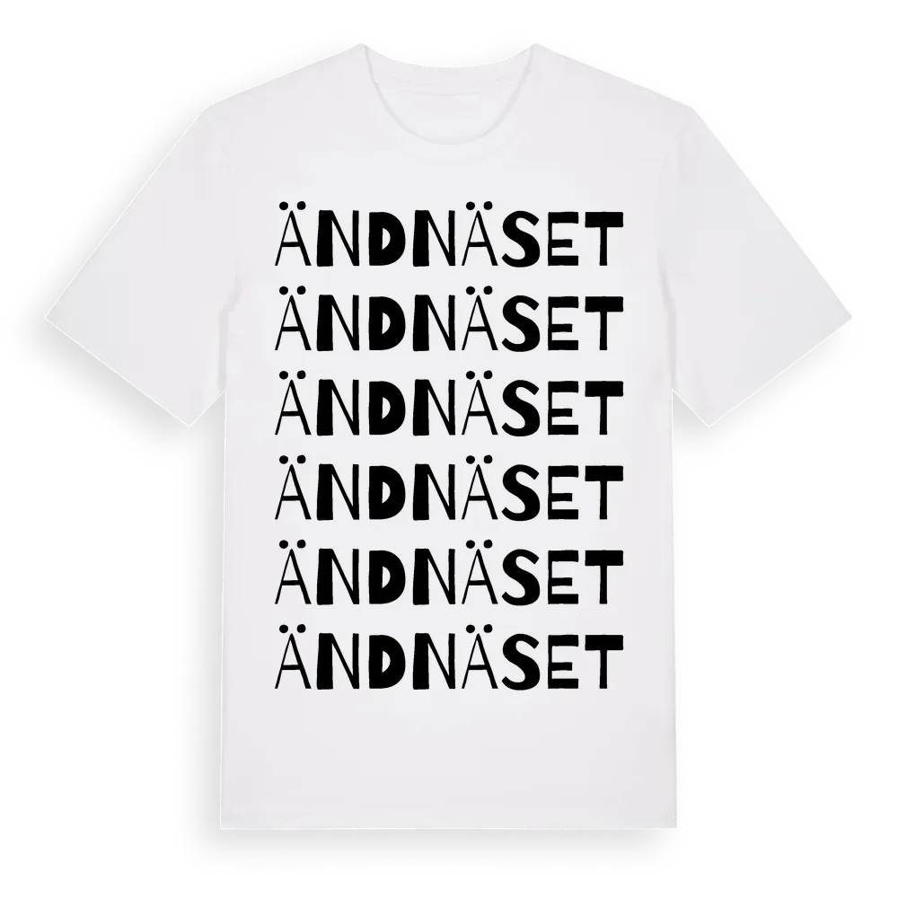 Ändnäset ordlek t-shirt är inspirerad av byn Ändnäset i Västra Götalands län, Sverige. Tröjan är designad för dig som har en speciell koppling till platsen – oavsett om du bor här, har rötterna här eller bara älskar Ändnäset.