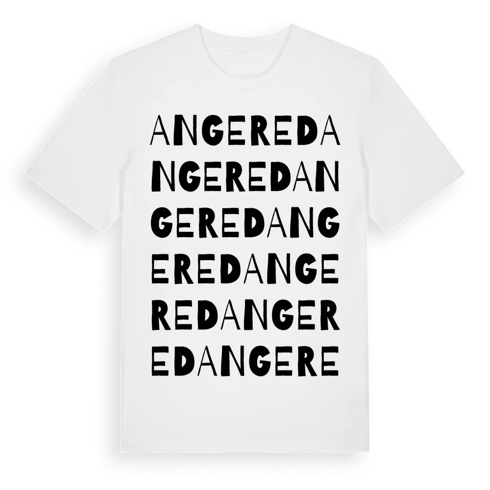 En ordlek byggd på Angereds namn. Subtilt och klurig – ett motiv som bara de som verkligen känner platsen fullt ut förstår. Premium bomull, unisex – från stadsdelen Angered i Västra Götalands län.