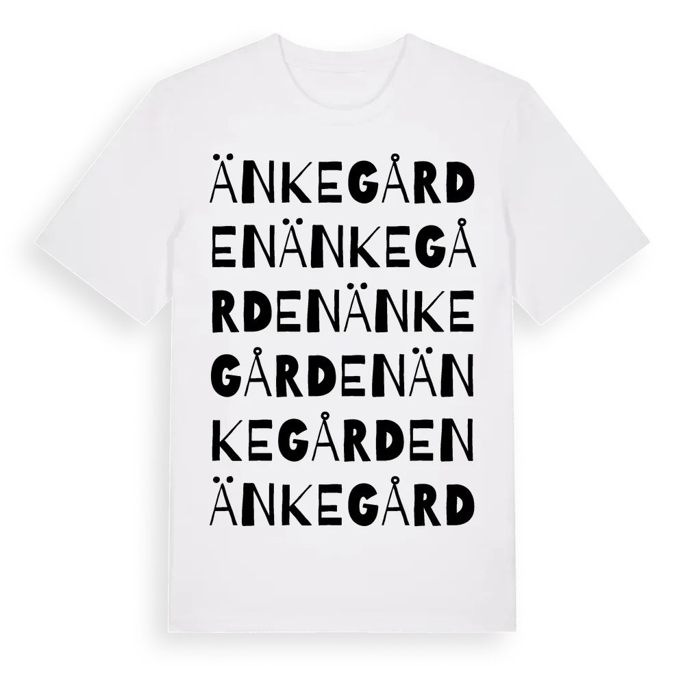 Änkegården ordlek t-shirt är inspirerad av byn Änkegården i Västra Götalands län, Sverige. Tröjan är designad för dig som har en speciell koppling till platsen – oavsett om du bor här, har rötterna här eller bara älskar Änkegården.