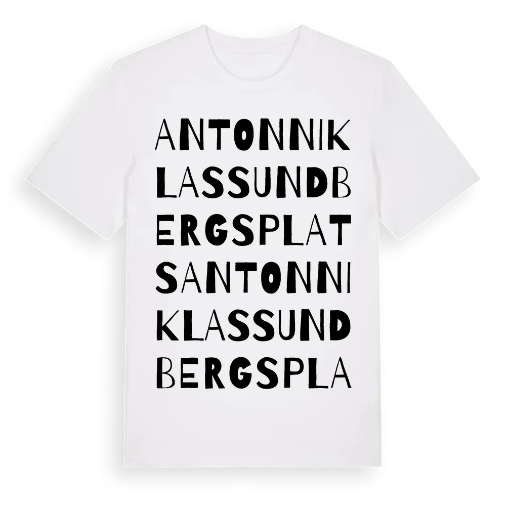Anton Niklas Sundbergs Plats ordlek t-shirt är inspirerad av Anton Niklas Sundbergs Plats i Västra Götalands län, Sverige. Tröjan är designad för dig som har en speciell koppling till platsen – oavsett om du bor här, har rötterna här eller bara älskar Anton Niklas Sundbergs Plats.