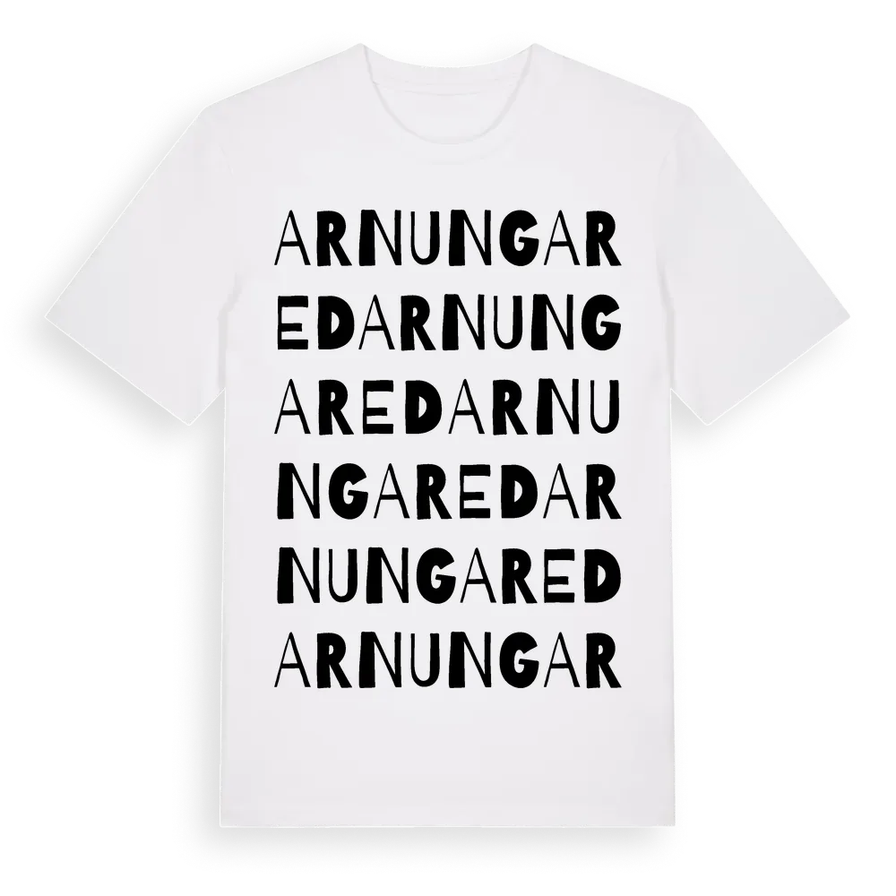 Arnungared ordlek t-shirt är inspirerad av byn Arnungared i Västra Götalands län, Sverige. Tröjan är designad för dig som har en speciell koppling till platsen – oavsett om du bor här, har rötterna här eller bara älskar Arnungared.