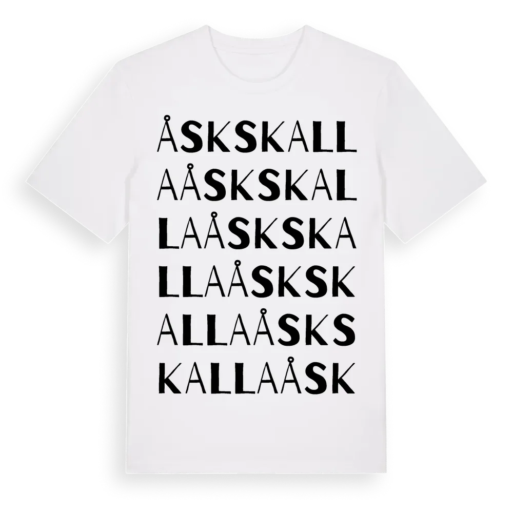 Åskskalla ordlek t-shirt är inspirerad av stadsdelen Åskskalla i Västra Götalands län, Sverige. Tröjan är designad för dig som har en speciell koppling till platsen – oavsett om du bor här, har rötterna här eller bara älskar Åskskalla.