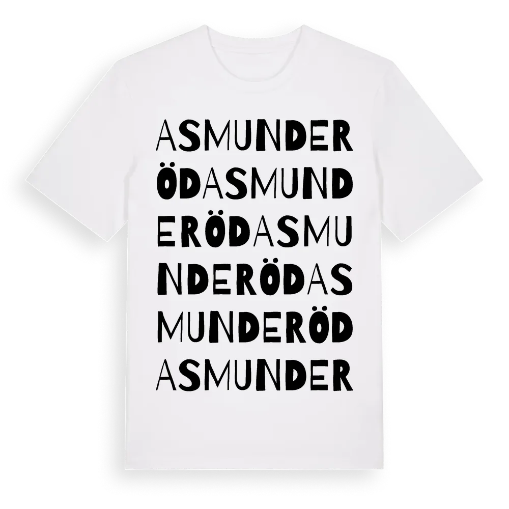 Asmunderöd ordlek t-shirt är inspirerad av Asmunderöd i Västra Götalands län, Sverige. Tröjan är designad för dig som har en speciell koppling till platsen – oavsett om du bor här, har rötterna här eller bara älskar Asmunderöd.
