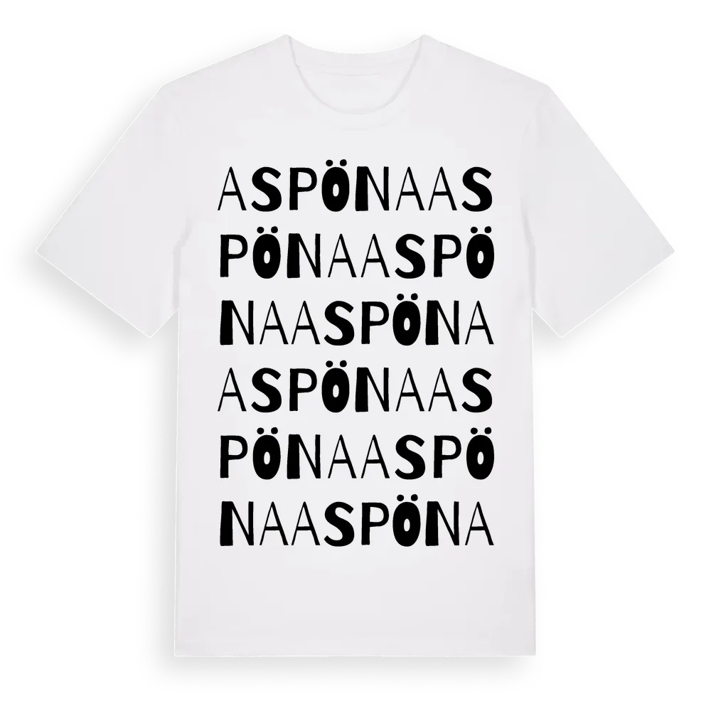 Aspöna ordlek t-shirt är inspirerad av Aspöna i Västra Götalands län, Sverige. Tröjan är designad för dig som har en speciell koppling till platsen – oavsett om du bor här, har rötterna här eller bara älskar Aspöna.