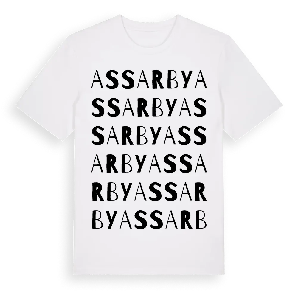 En ordlek byggd på Assarbys namn. Subtilt och klurig – ett motiv som bara de som verkligen känner platsen fullt ut förstår. Premium bomull, unisex – från byn Assarby i Västra Götalands län.