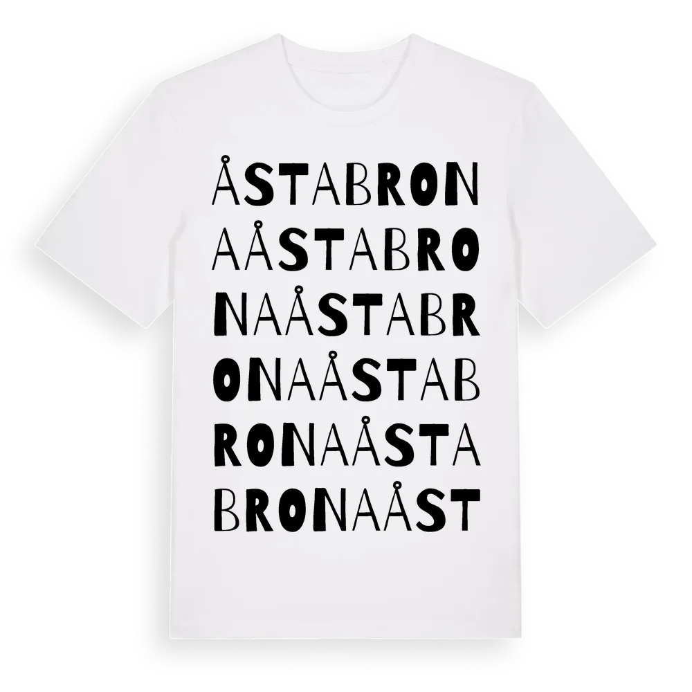 Åstabrona ordlek t-shirt är inspirerad av Åstabrona i Västra Götalands län, Sverige. Tröjan är designad för dig som har en speciell koppling till platsen – oavsett om du bor här, har rötterna här eller bara älskar Åstabrona.