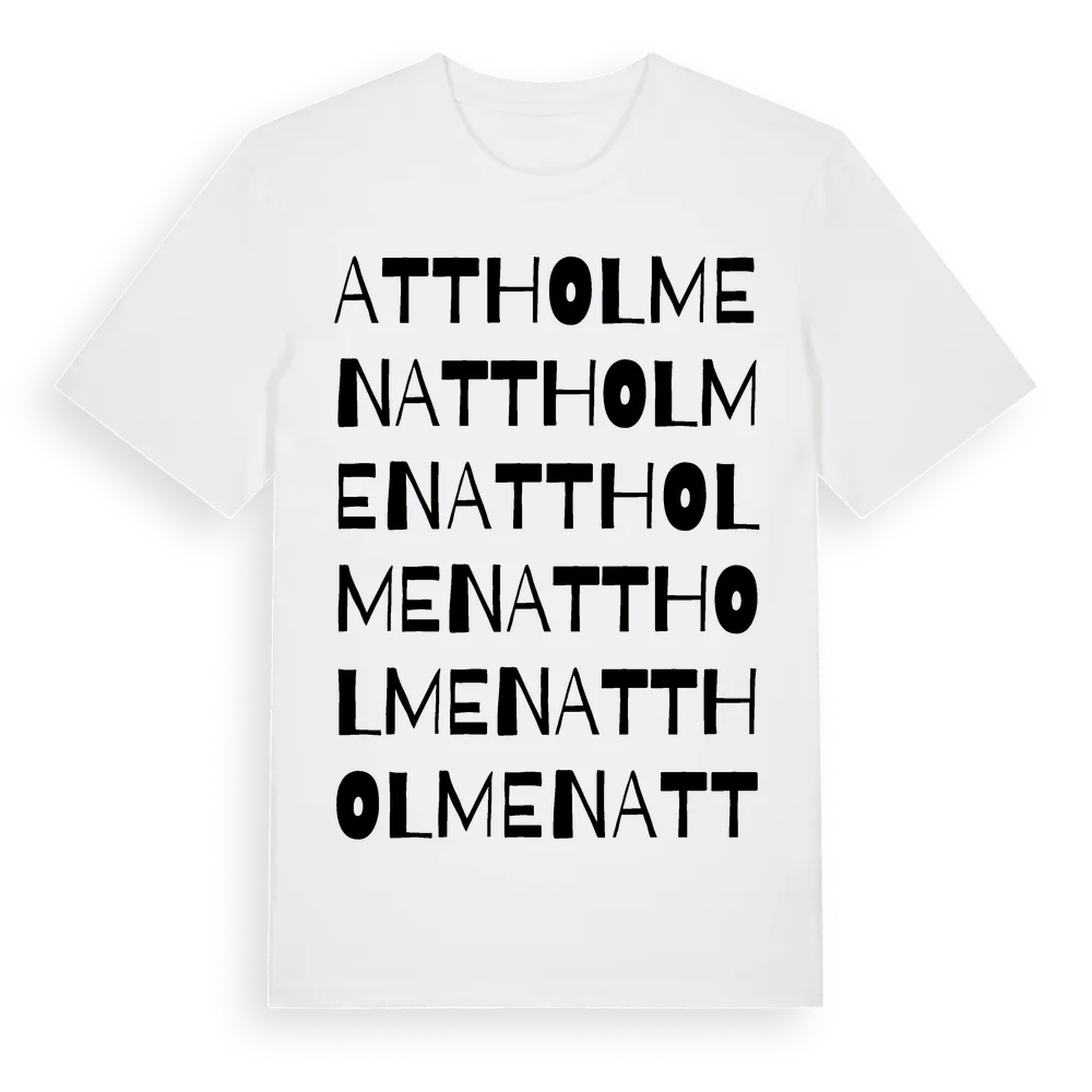 Attholmen ordlek t-shirt är inspirerad av byn Attholmen i Västra Götalands län, Sverige. Tröjan är designad för dig som har en speciell koppling till platsen – oavsett om du bor här, har rötterna här eller bara älskar Attholmen.