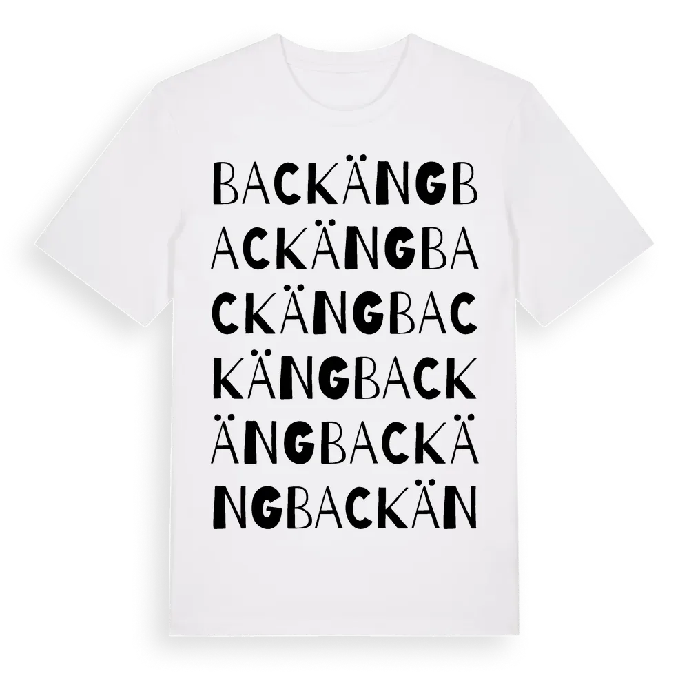 Backäng ordlek t-shirt är inspirerad av Backäng i Västra Götalands län, Sverige. Tröjan är designad för dig som har en speciell koppling till platsen – oavsett om du bor här, har rötterna här eller bara älskar Backäng.