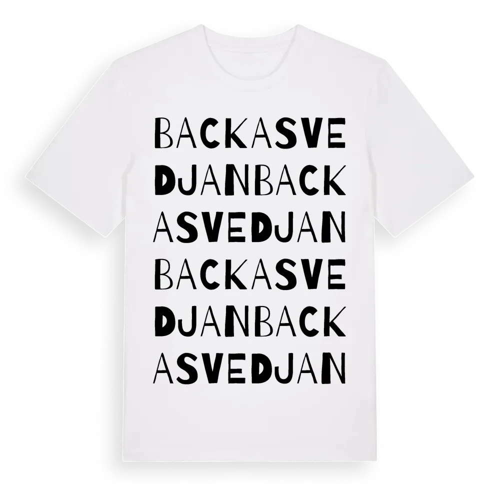 Backasvedjan ordlek t-shirt är inspirerad av byn Backasvedjan i Västra Götalands län, Sverige. Tröjan är designad för dig som har en speciell koppling till platsen – oavsett om du bor här, har rötterna här eller bara älskar Backasvedjan.