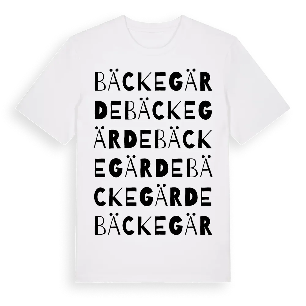 Bäckegärde ordlek t-shirt är inspirerad av byn Bäckegärde i Västra Götalands län, Sverige. Tröjan är designad för dig som har en speciell koppling till platsen – oavsett om du bor här, har rötterna här eller bara älskar Bäckegärde.
