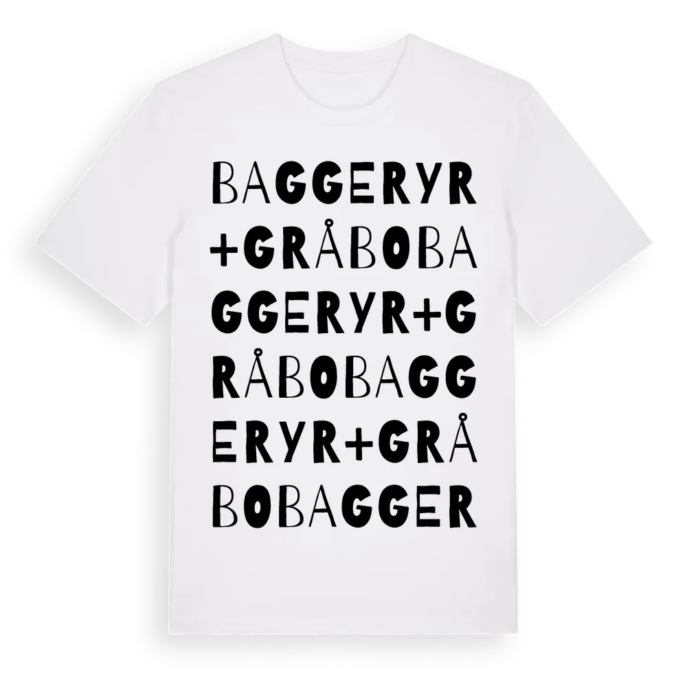 Baggeryr+Gråbo ordlek t-shirt är inspirerad av byn Baggeryr+Gråbo i Västra Götalands län, Sverige. Tröjan är designad för dig som har en speciell koppling till platsen – oavsett om du bor här, har rötterna här eller bara älskar Baggeryr+Gråbo.