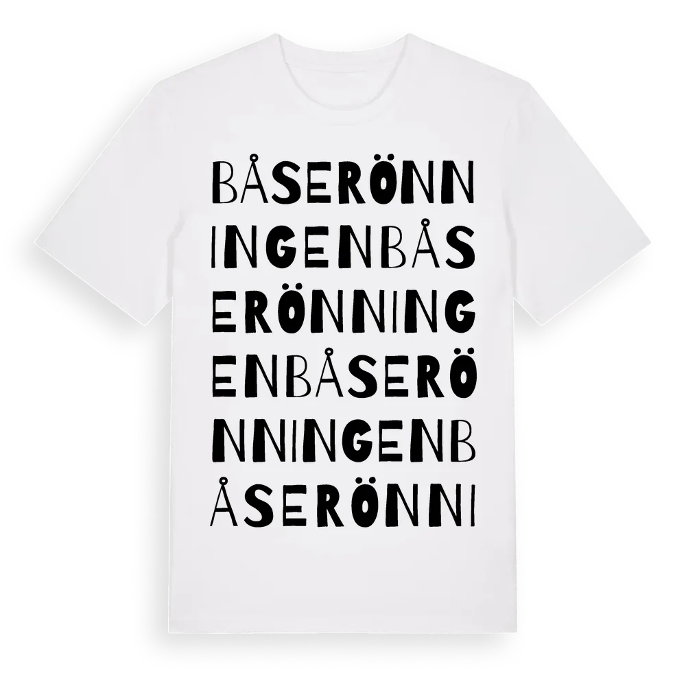 Båserönningen ordlek t-shirt är inspirerad av Båserönningen i Västra Götalands län, Sverige. Tröjan är designad för dig som har en speciell koppling till platsen – oavsett om du bor här, har rötterna här eller bara älskar Båserönningen.