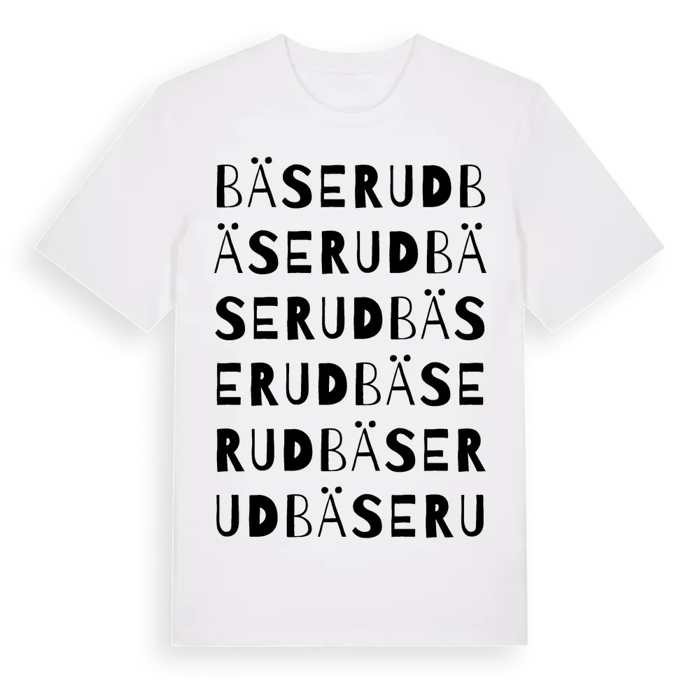 Bäserud ordlek t-shirt är inspirerad av Bäserud i Västra Götalands län, Sverige. Tröjan är designad för dig som har en speciell koppling till platsen – oavsett om du bor här, har rötterna här eller bara älskar Bäserud.